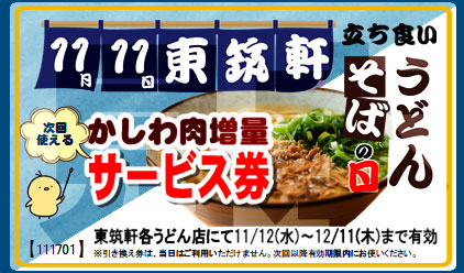 | 条件 | 11月11日(土)に、うどん又はそばをご注文のお客様 |